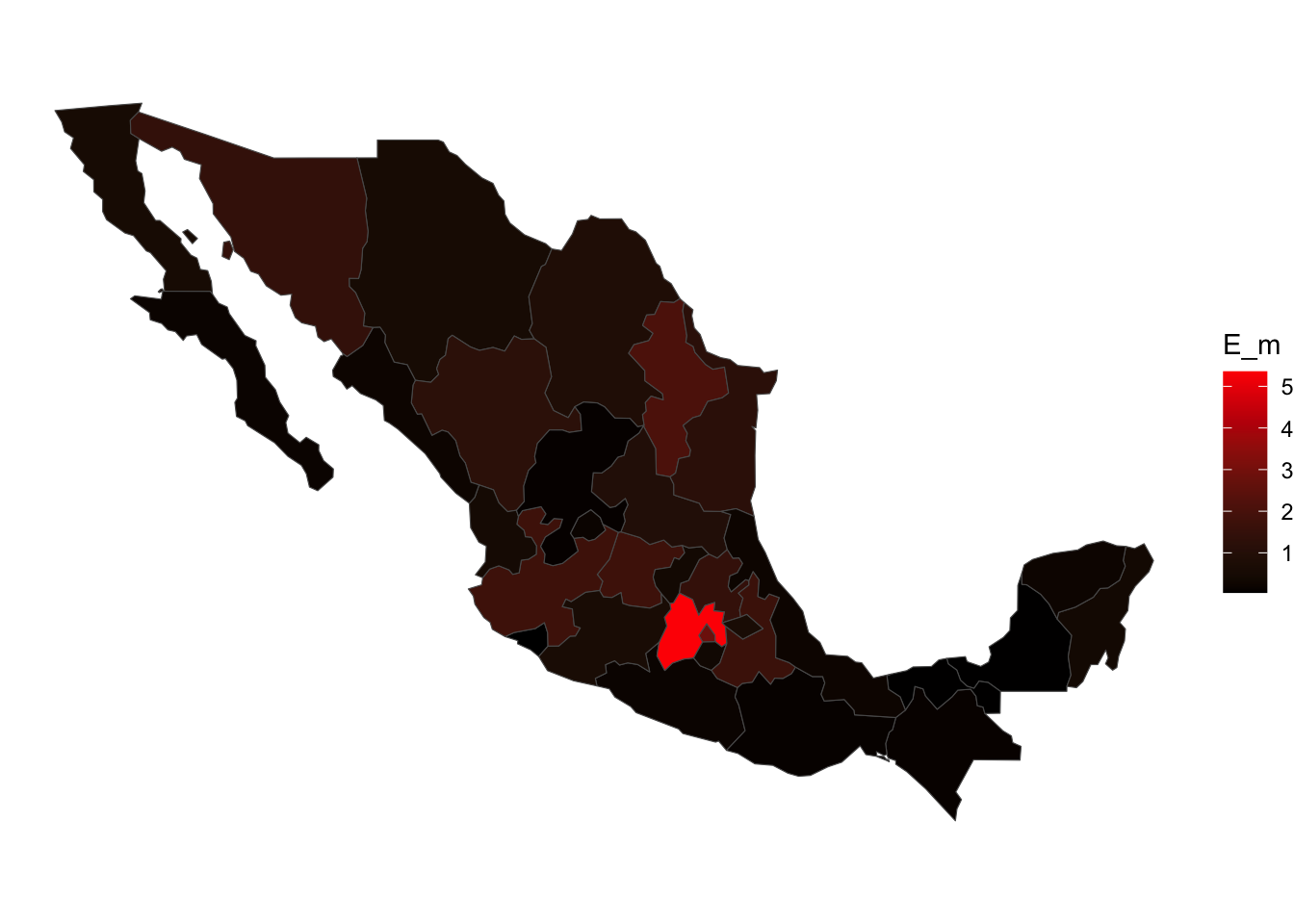 geom_sf(aes(fill = E_m)) + # We add a layer representing the polygons colored by the variable E
