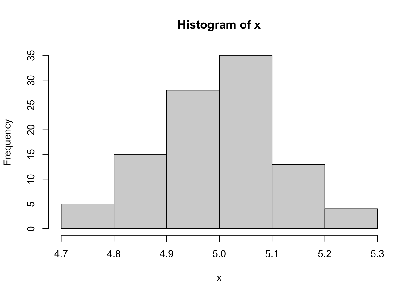 By default, R has several functions to sample a distribution and plot the results. For example, if we would like to sample a normal distribution with a mean of 5 and standard deviation of 0.12, we can use the following code: