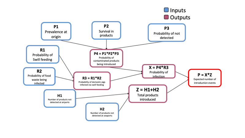 Lets see an example of a pre-made model file. The following model was based on a risk assessment performed by the OIRSA (Organismo Internacional Regional de Sanidad Agropecuaria) for the introduction of ASF into the countries that are part of OIRSA, you can read more about this report in this link. The model estimates the number of introduction events from imported animal products swill feeding in a given year.