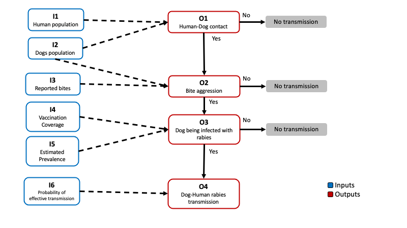 We need identify the inputs and outputs, and the relationships between the nodes in our scenario tree. To parametrize our model we will be using the data reported by the vaccination program (such as dog and human population, bite reports, and vaccination coverage) and some theoretical distributions that we can parametrize based on expert opinion or ‘what if?’ scenarios.